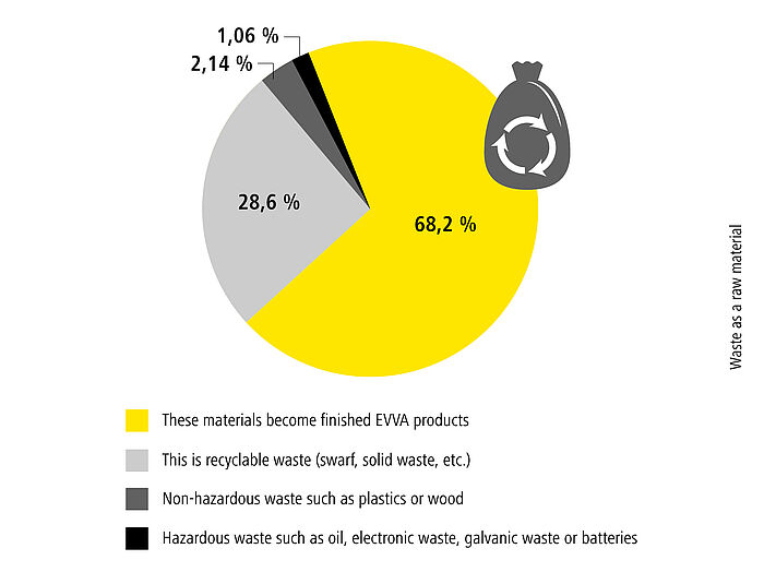 EVVA sees waste as a raw material that must be used as sparingly as possible. Waste prevention starts with the inflow and use of resources. A topic that EVVA has identified as essential at the headquarters (which organises virtually all of the Group’s purchasing). Our concepts and “R” principles (Recycling, Reduce, Reuse, etc.) are described under Circular economy overview.
